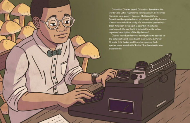 In 1882, Black botanist and mycologist Charles S. Parker sprouted up in the lush, green Pacific Northwest. From the beginning, Charles’s passion was plants, and he trudged through forests, climbed mountains, and waded into lakes to find them. When he was drafted to fight in World War I, Charles experienced prejudice against Black soldiers and witnessed the massive ecological devastation that war caused. Those experiences made him even more determined to follow his dreams, whatever the difficulties, and to have a career making things grow, not destroying them.